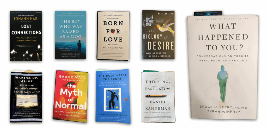 When it comes to understanding ourselves, how we function, how emotions work, how they drive us for better and worse—here is an image showing a selection of books I’ve found immense value in: